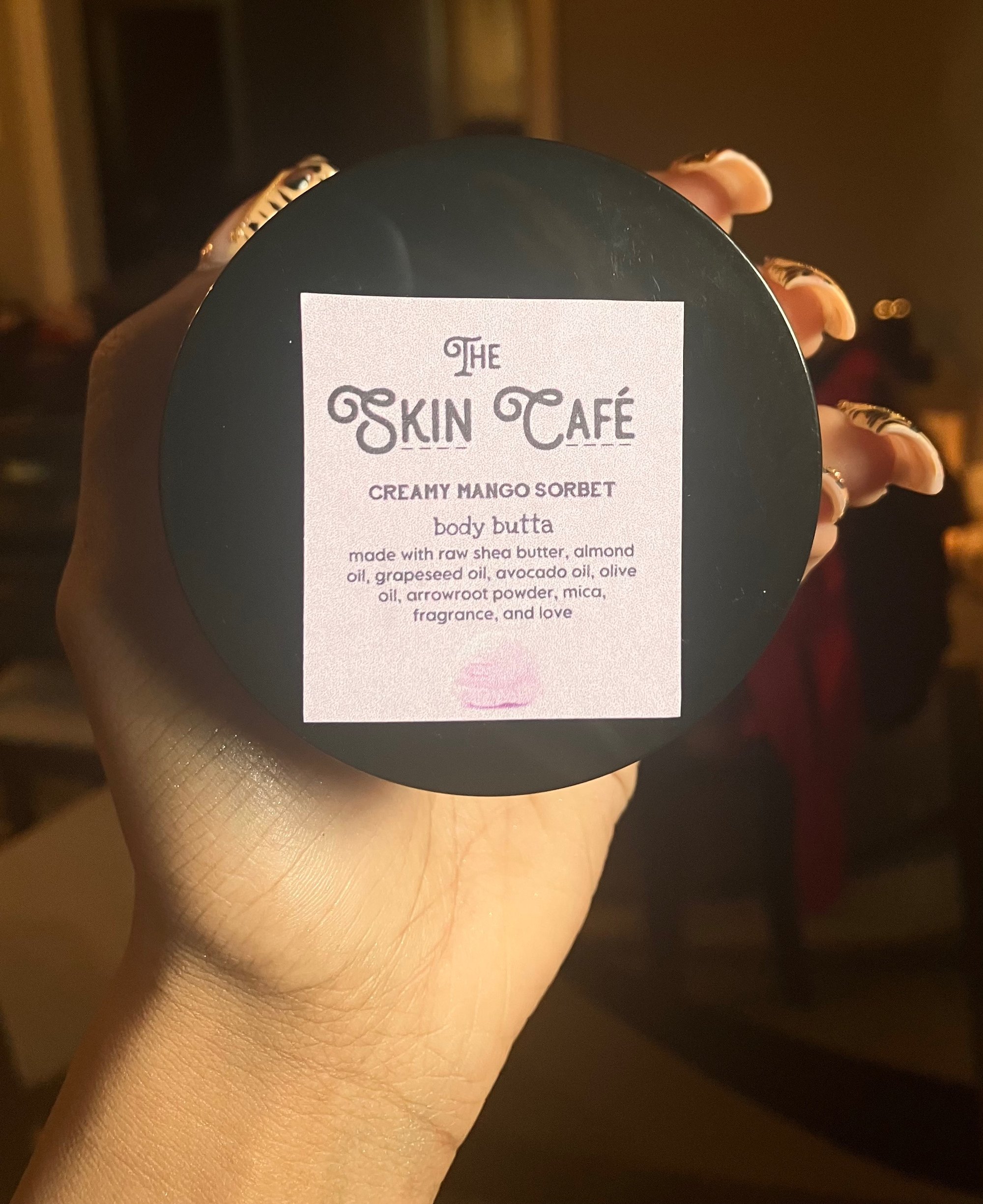 Made with raw organic shea butter, almond oil, grapeseed oil, olive oil, avocado oil, fragrance oil, mica, arrowroot powder, and love.
