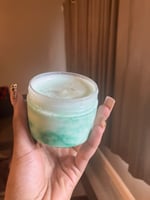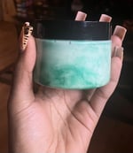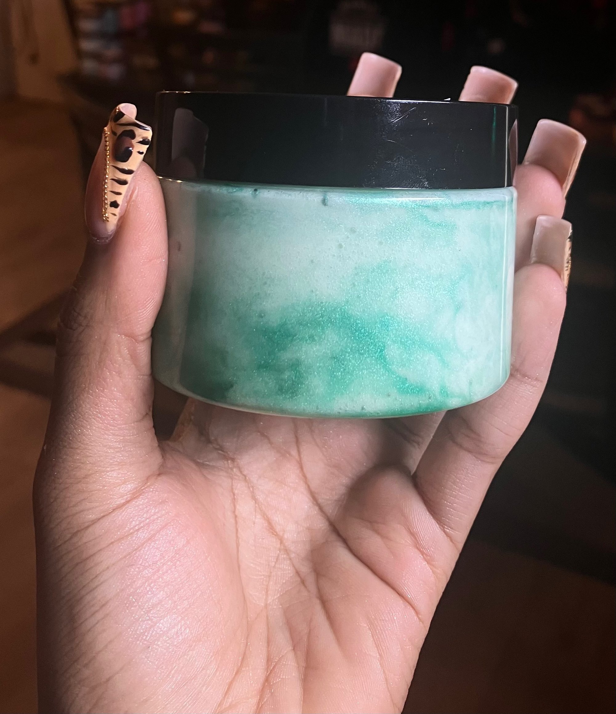Made with raw organic shea butter, almond oil, grapeseed oil, olive oil, avocado oil, fragrance oil, mica, arrowroot powder, and love.