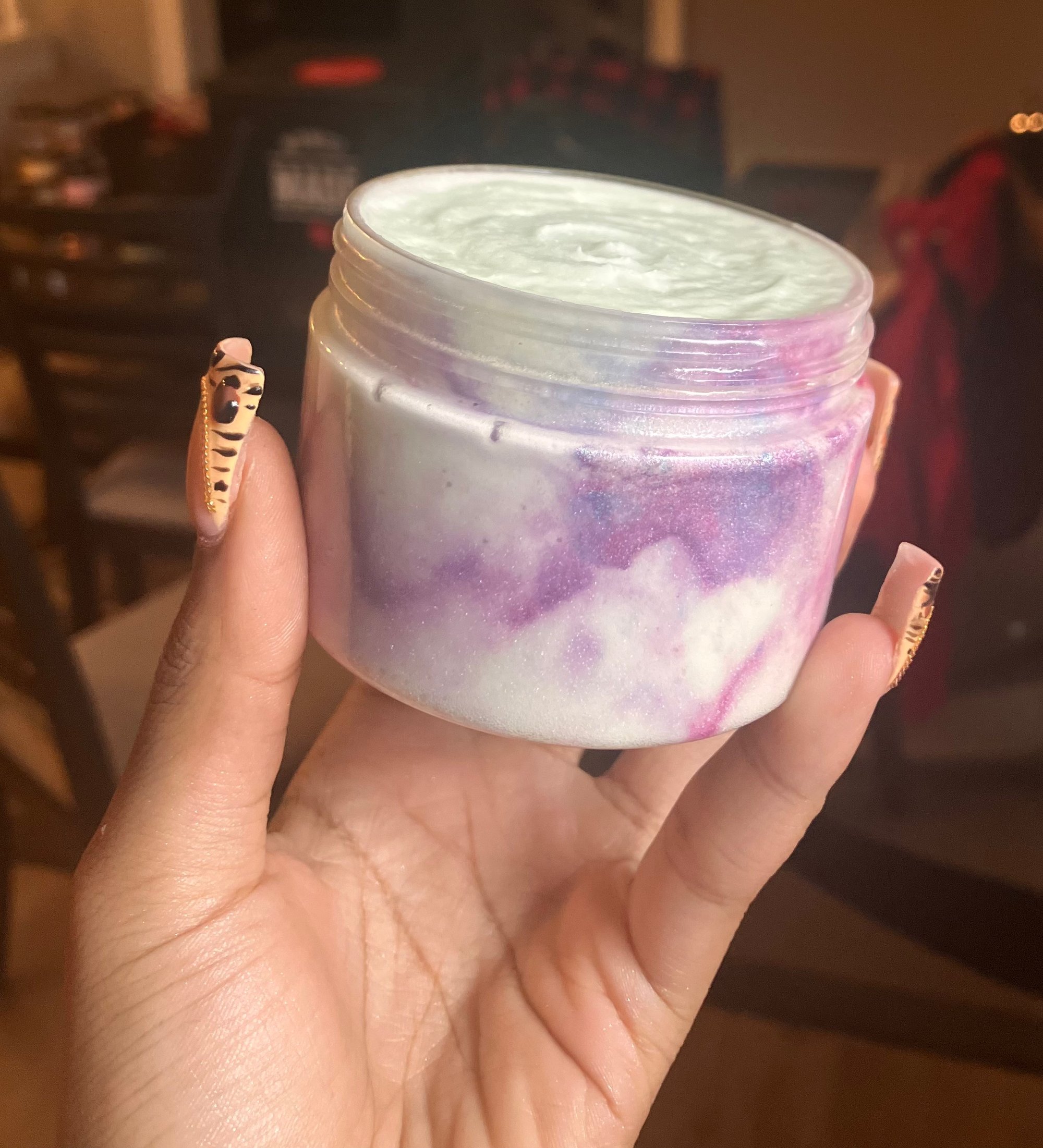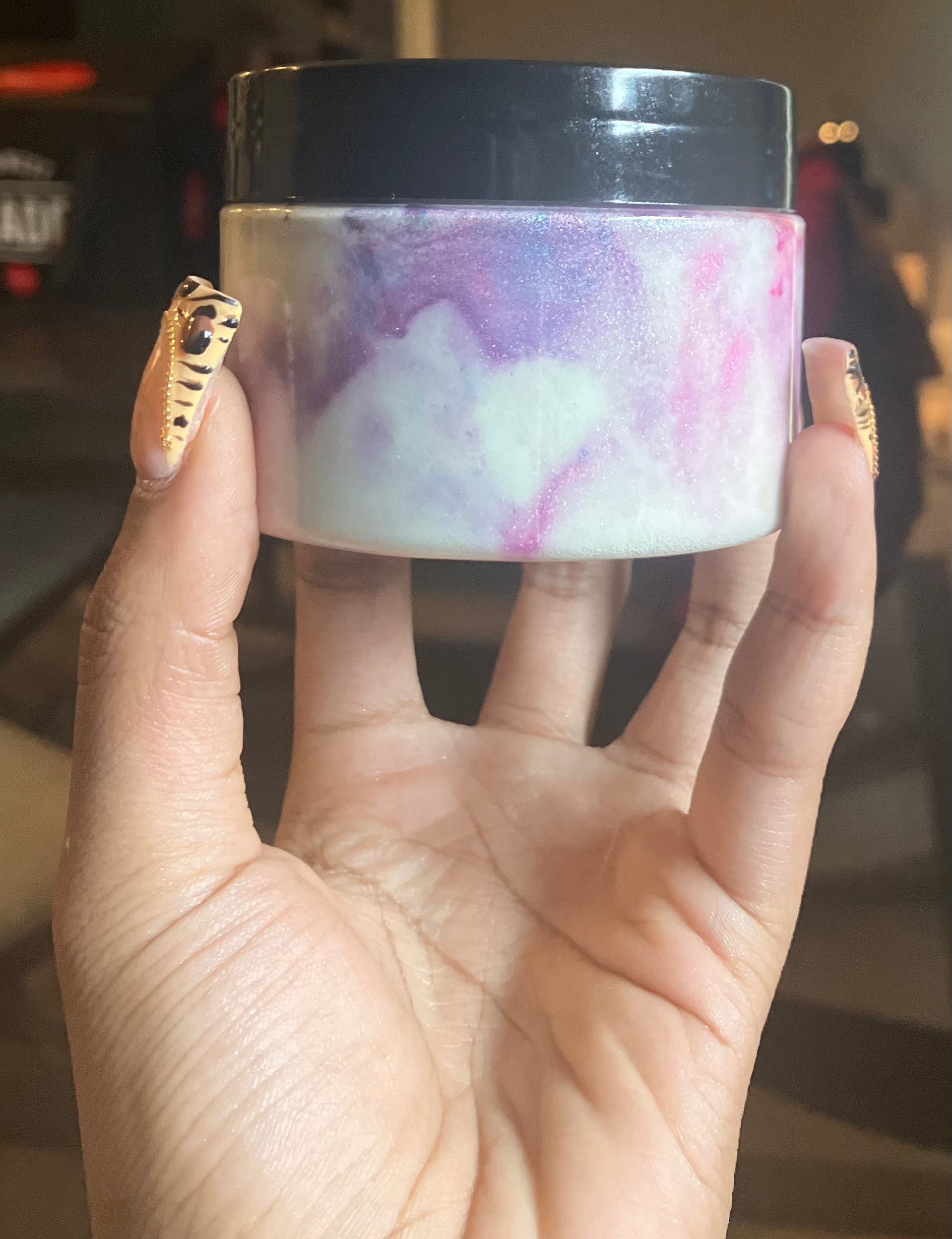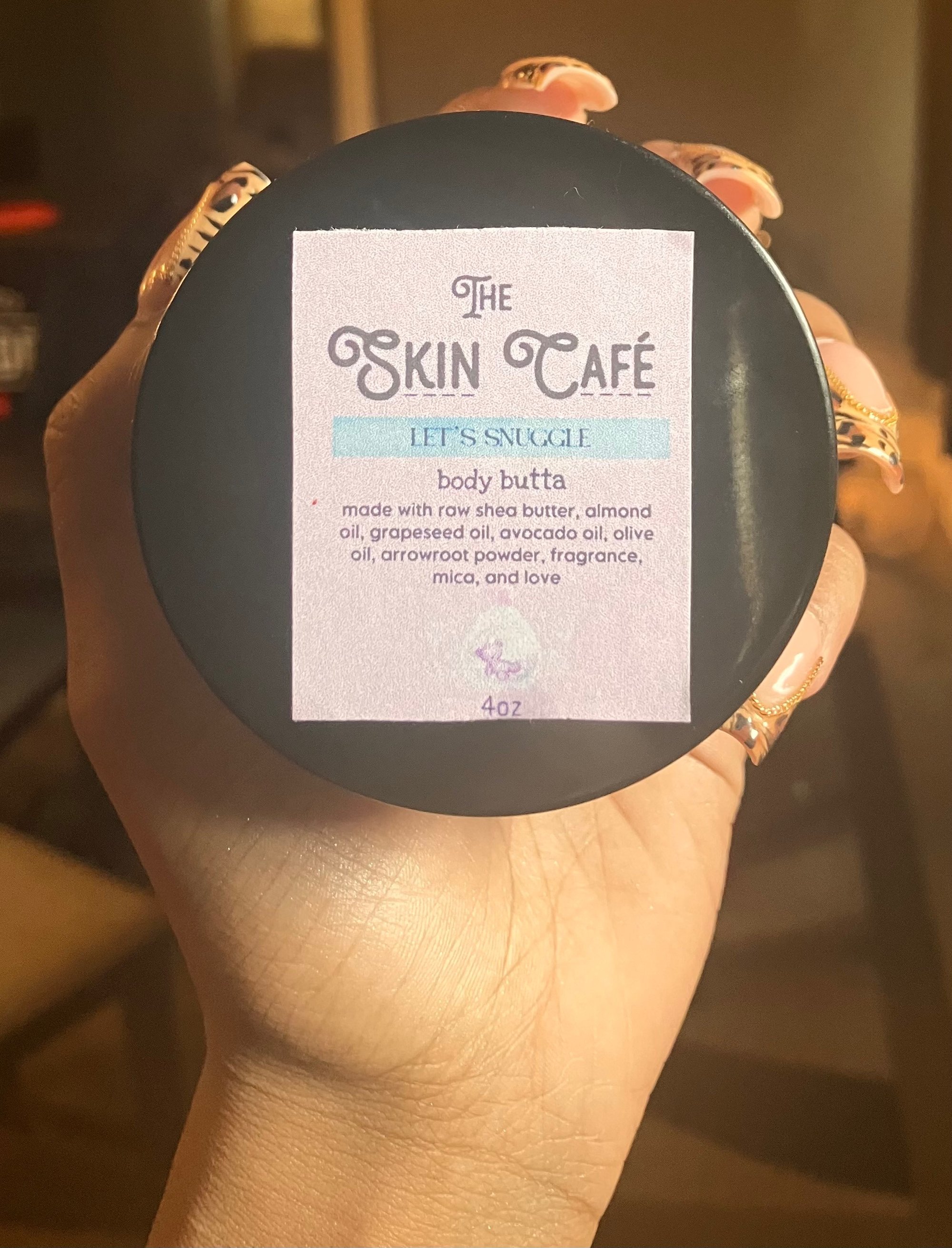 Made with raw organic shea butter, almond oil, grapeseed oil, olive oil, avocado oil, fragrance oil, mica, arrowroot powder, and love.