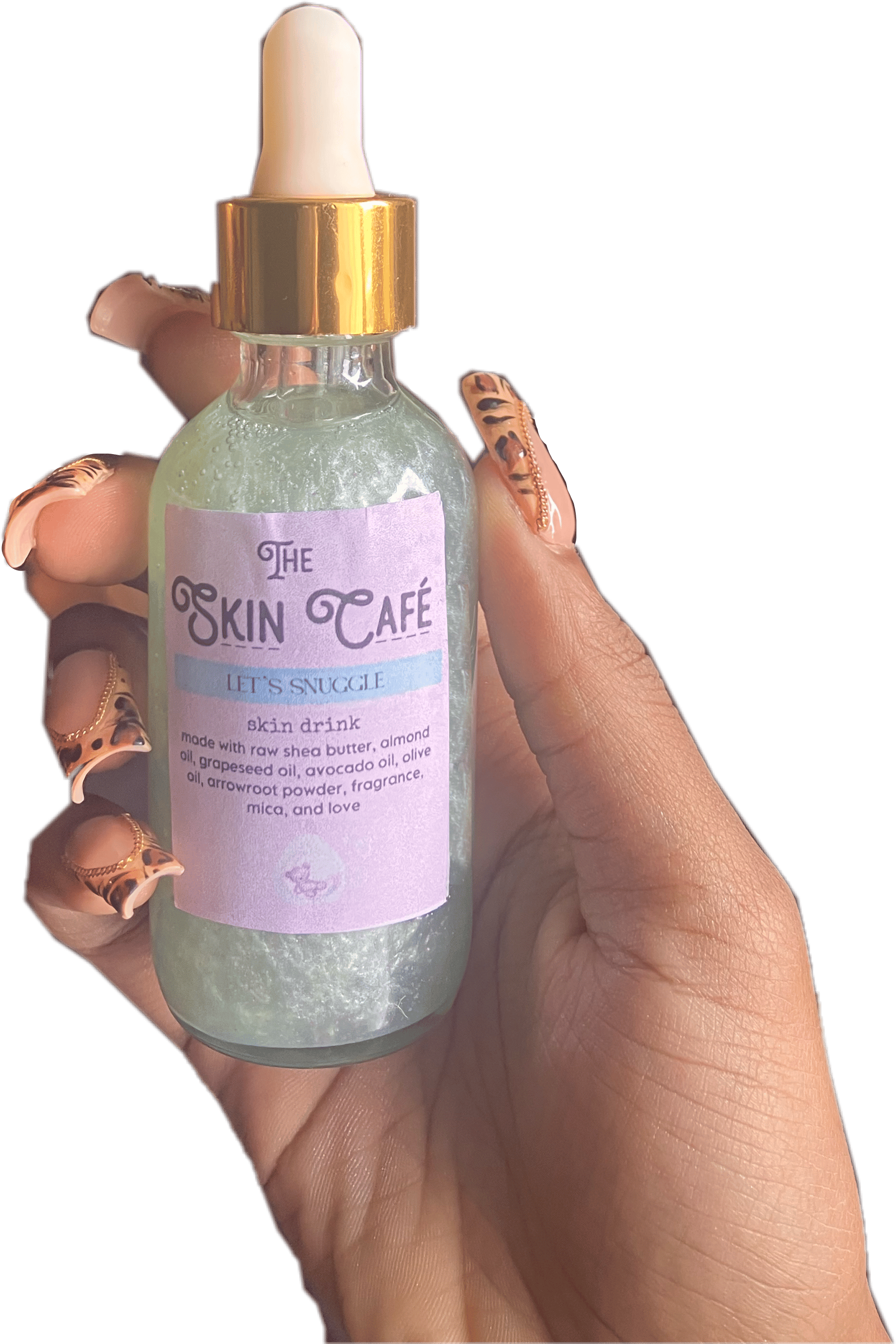 Made with almond oil, grapeseed oil, olive oil, fragrance oil, mica, and love.