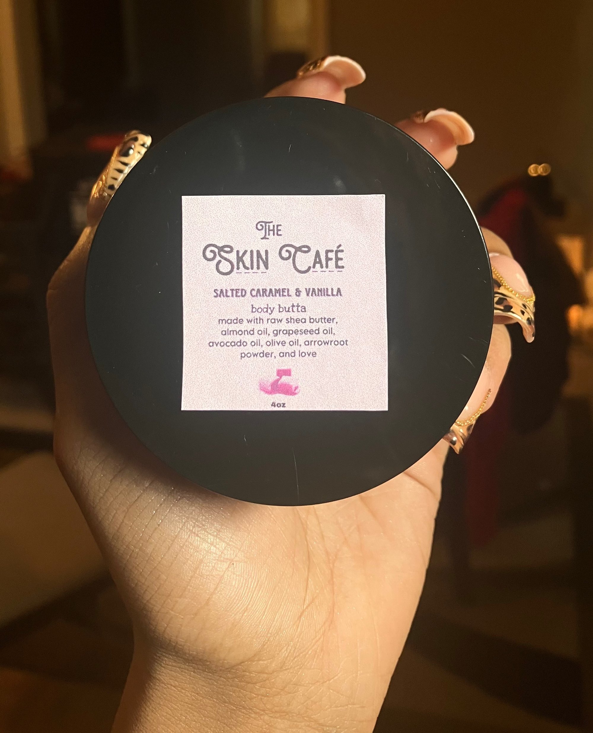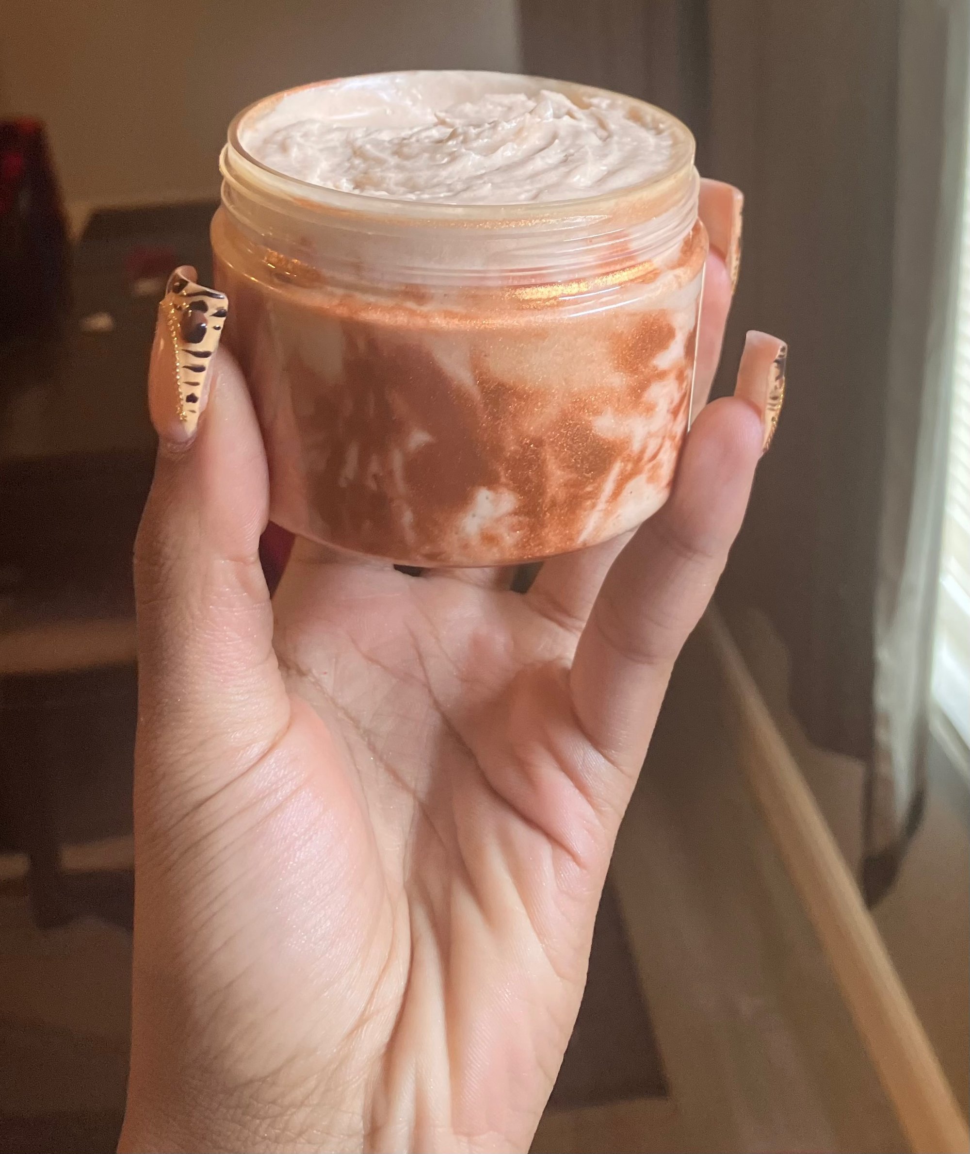 Made with raw organic shea butter, almond oil, grapeseed oil, olive oil, avocado oil, fragrance oil, mica, arrowroot powder, and love.