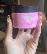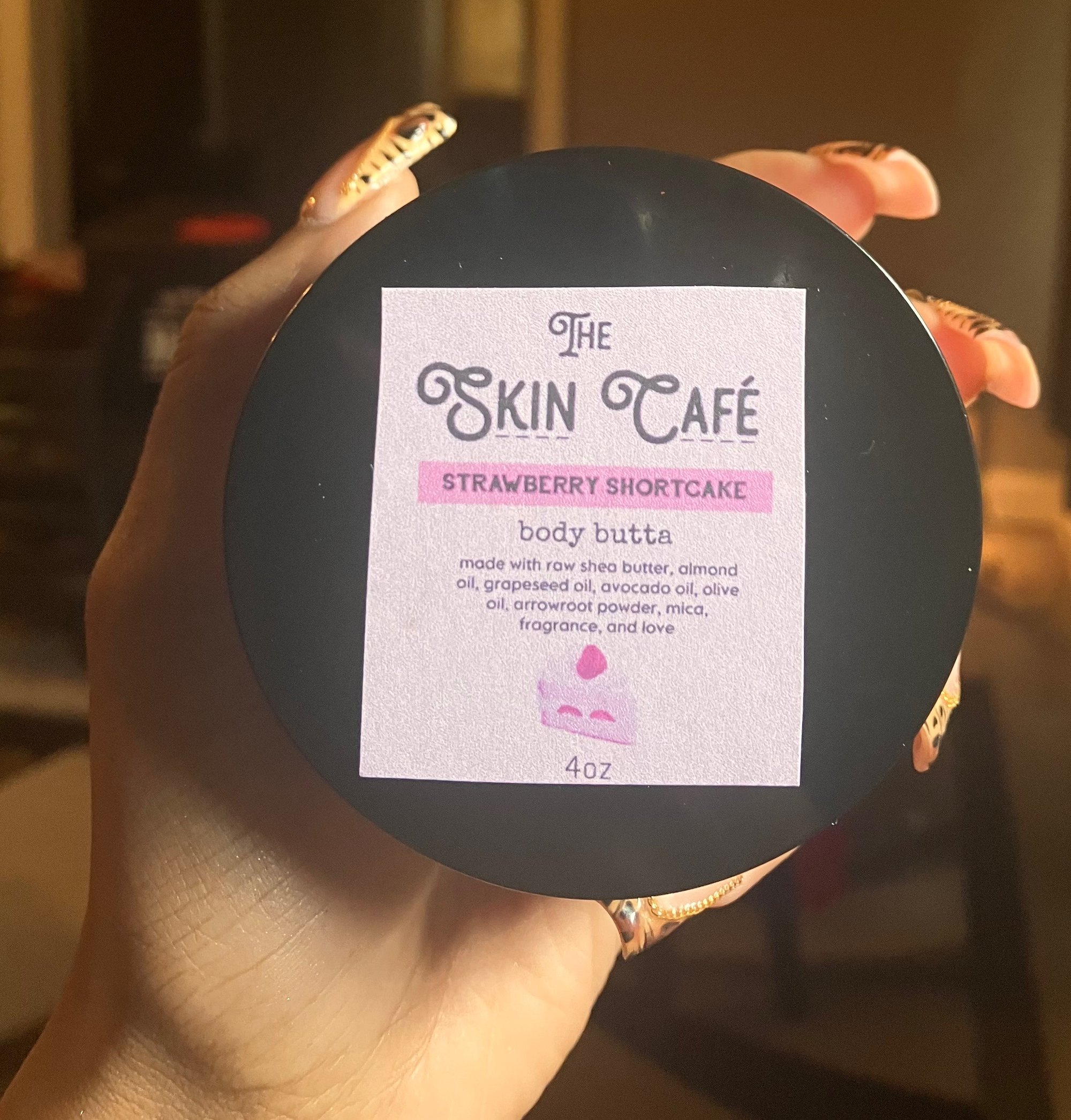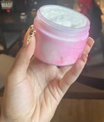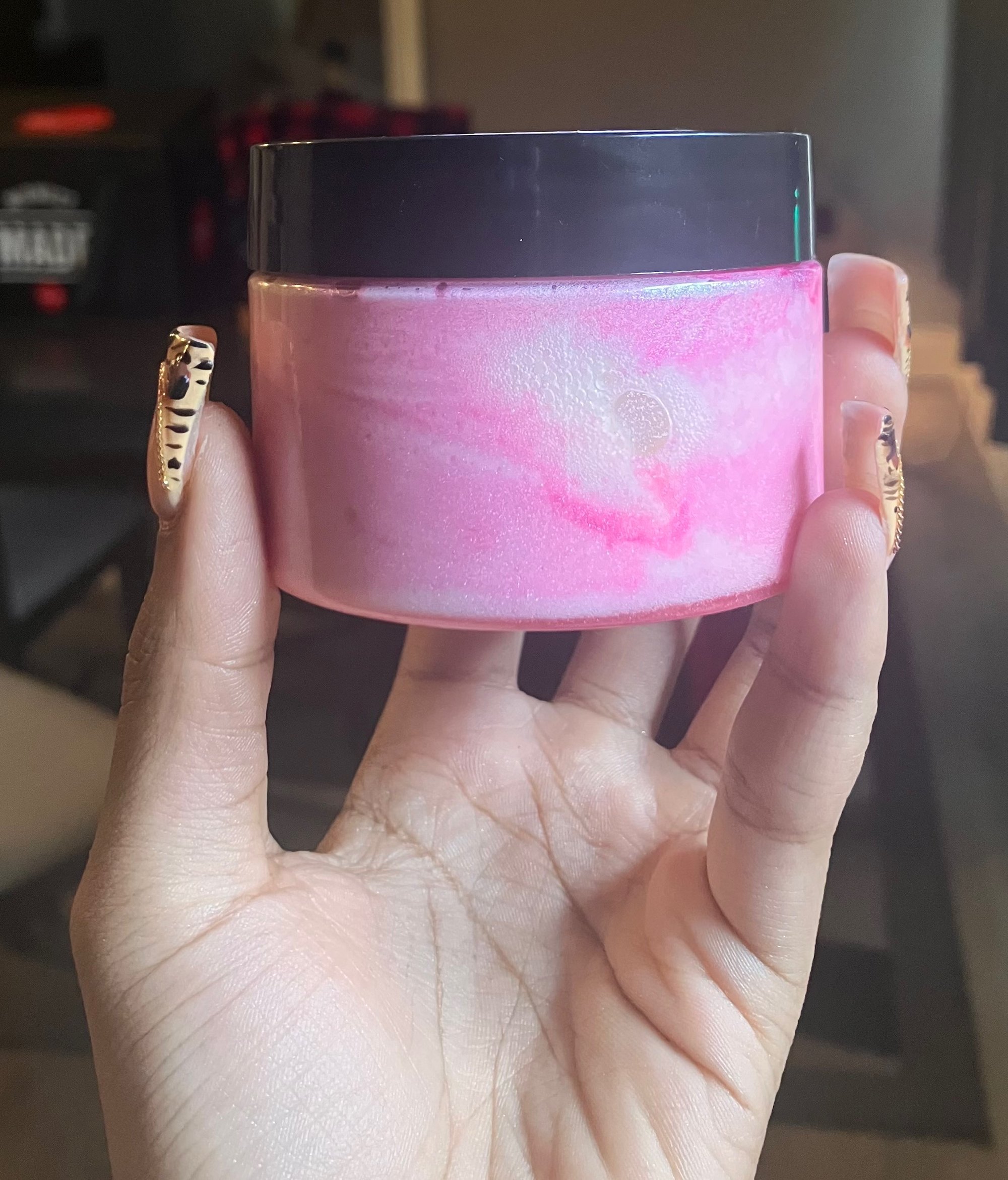 Made with raw organic shea butter, almond oil, grapeseed oil, olive oil, avocado oil, fragrance oil, mica, arrowroot powder, and love.